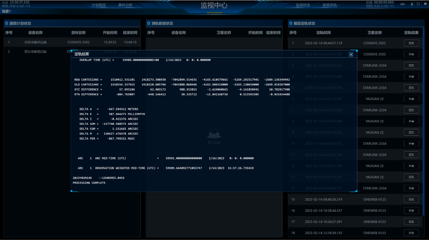 天感应用平台主要针对太空态势感知领域典型需求,采用结构化、组件化设计理念以及并行计算、高精度轨道确定与预报等核心技术,设计并实现了包括外测数据汇集与处理、空间目标发现识别、编目定轨、碰撞预警、陨落预报等多项空间目标感知处理业务功能于一体的太空态势感知应用平台,为在轨航天器运行提供了各种太空事件感知预警及轨道编目的分析和数据支撑。